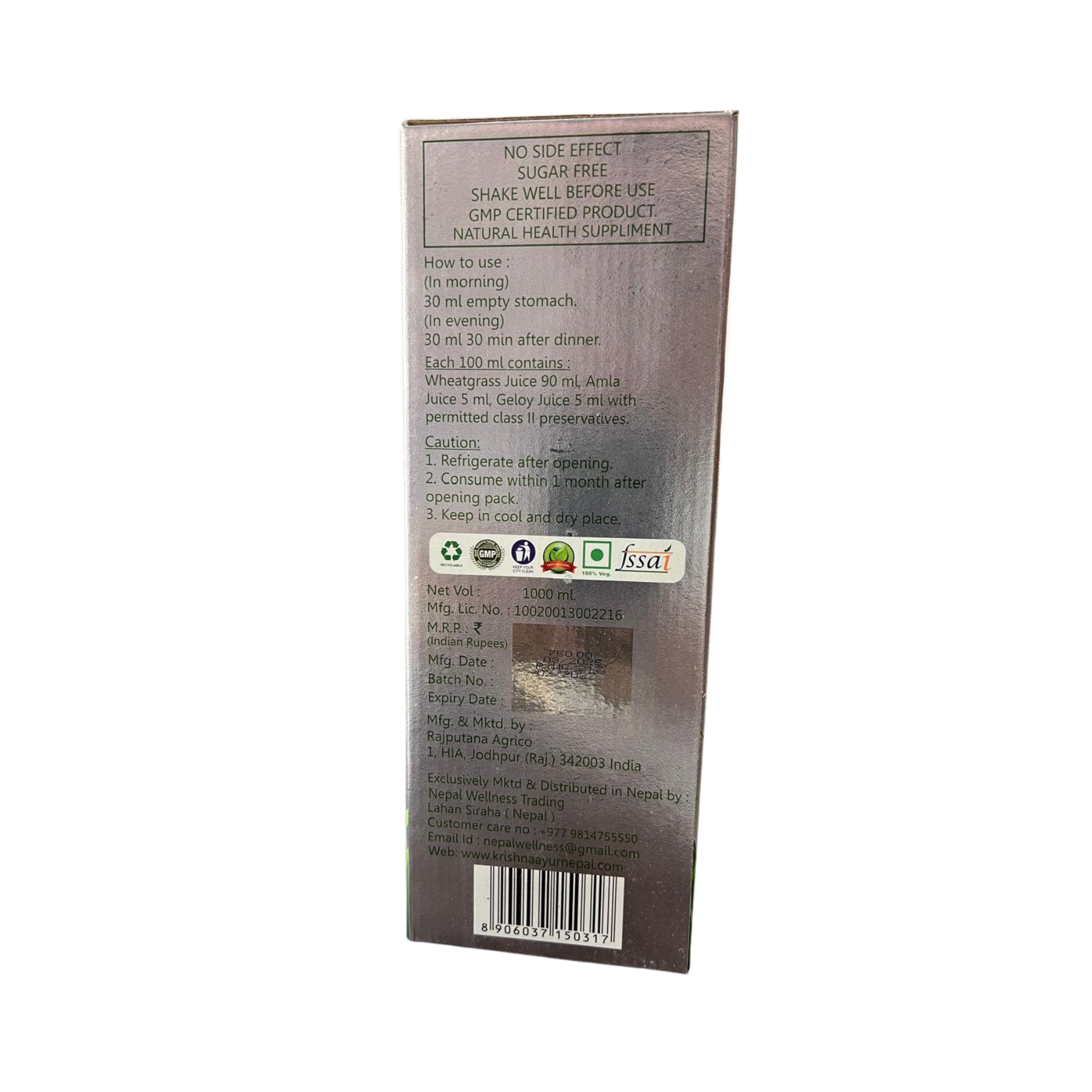 Ayurvedic Juices100% natural Wheatgrass Juice enriched with Amla and Giloy for detoxification, immunity, and overall vitality. Sugar-free, preservative-protected, and GMP-certified — a pure Ayurvedic health supplement by Krishna’s Herbal & Ayurveda.